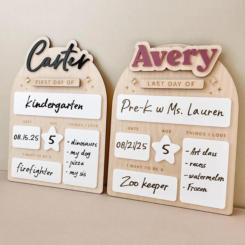 Capture every milestone from preschool to first grade and beyond with this back to school first day of kindergarten personalized first day of school sign. This reusable first day school sign features interchangeable "First Day Of" and "Last Day Of", plus your choice of a single attached name or multiple un-attached names for easy updates year after year. A perfect personalized school board sign for daycare, pre-k, kindergarten, and all the school years ahead.